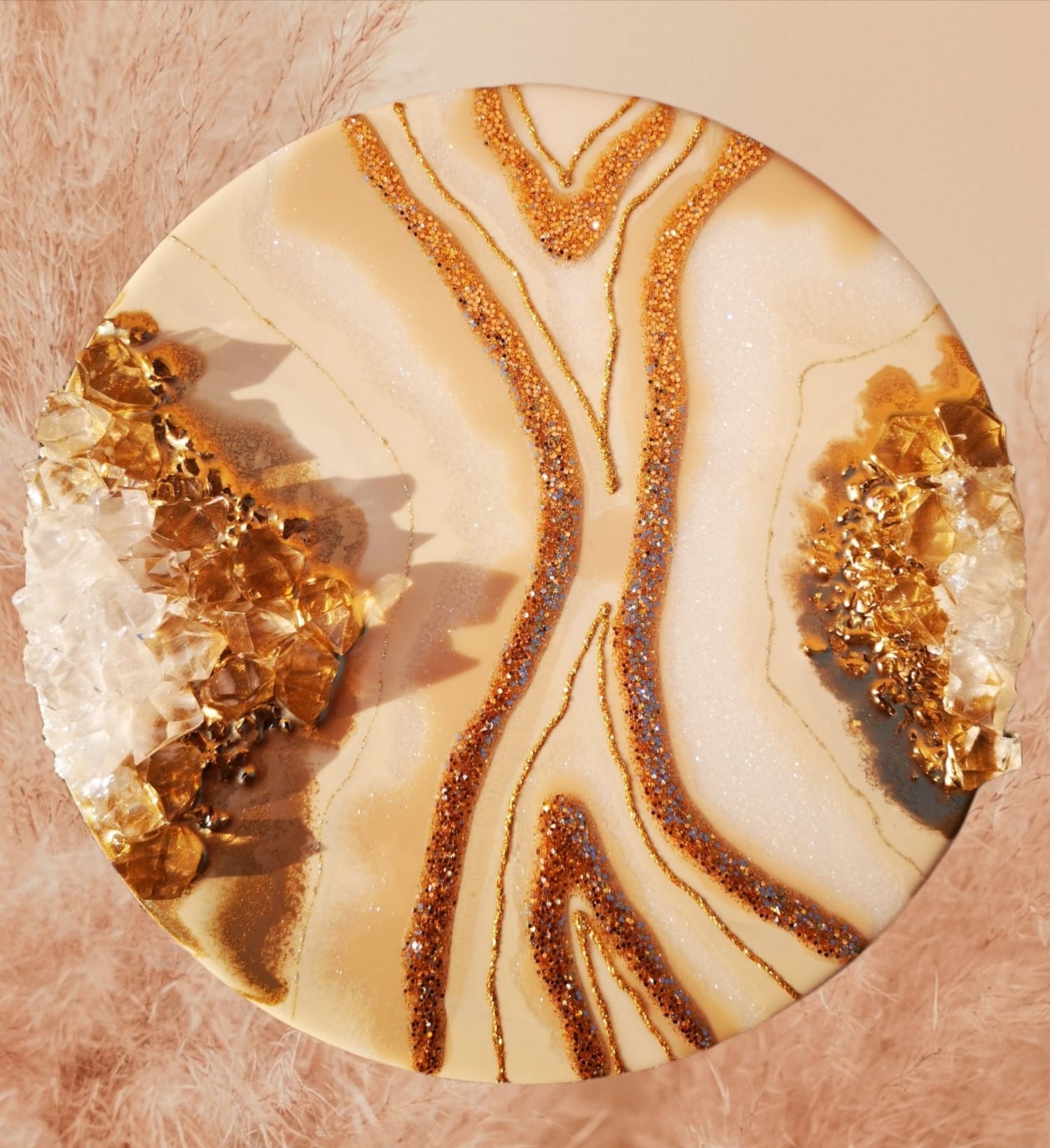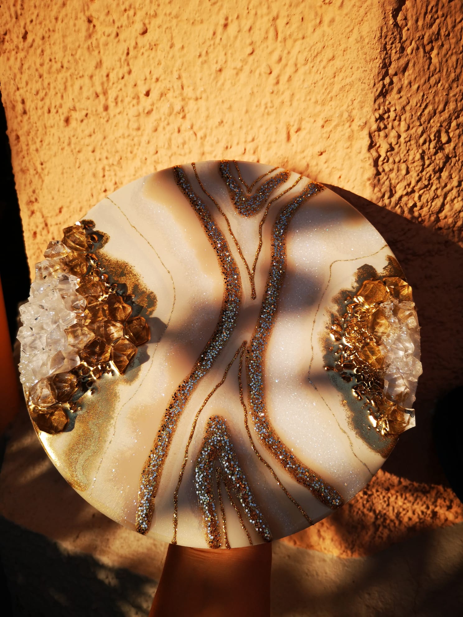 Runde Geode auf massivem Holz in beige-creme Tönen. Mixed Media mit Acryl und Glassteinen. Inkl. Aufhängung