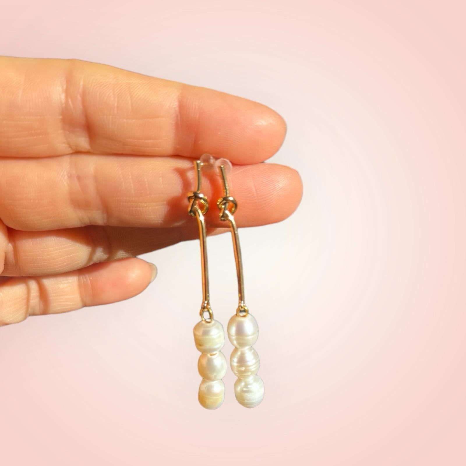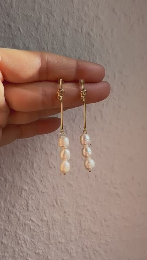 Earrings with three pearls on an 18K gold-plated stud with a small knot. Very lightweight.