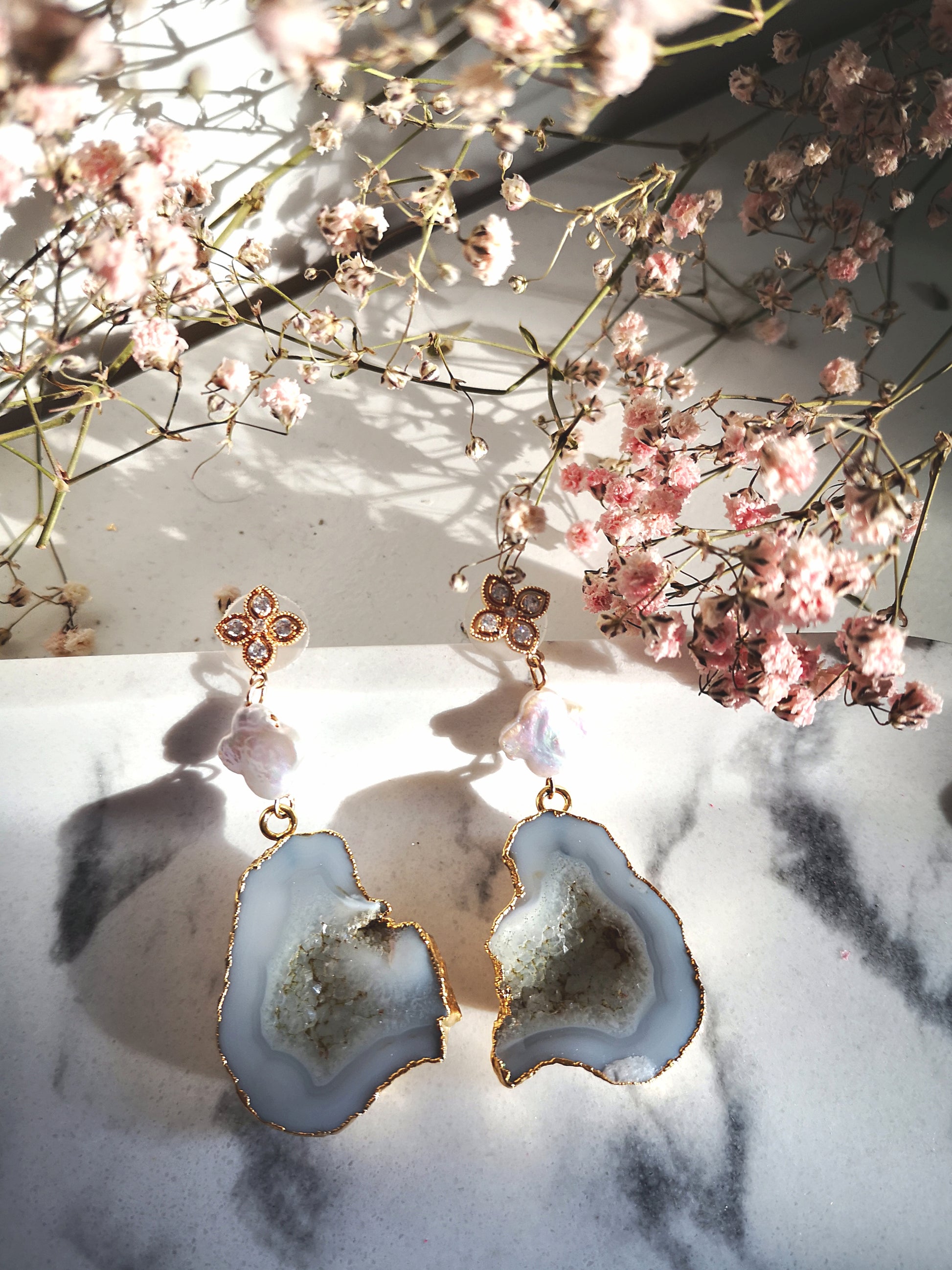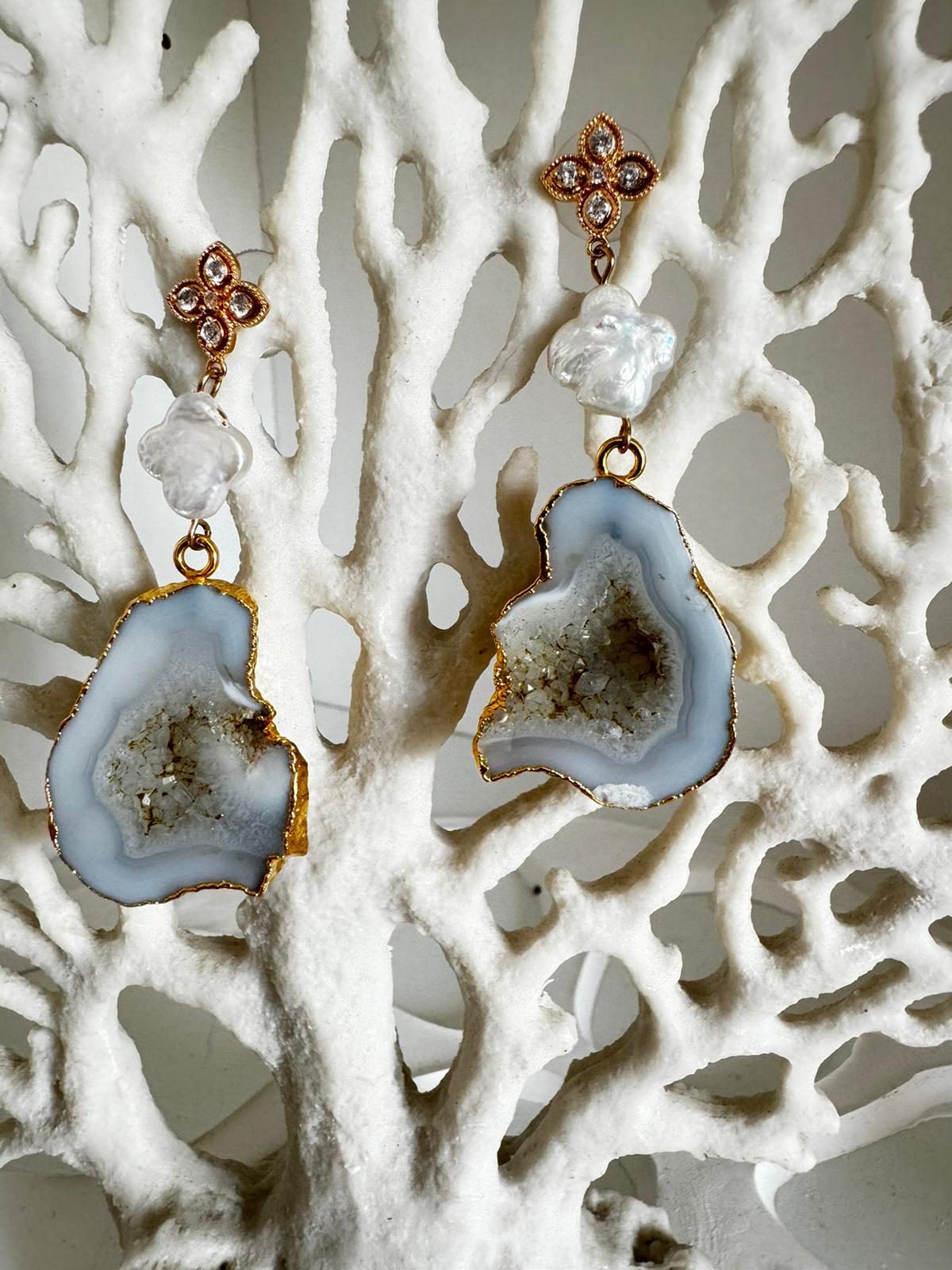Wunderschöne weiße Geoden mit Süßwasserperlen Lreuz/Kleeblatt. Der Stecker mit winzigen Kristallen ebenfalls in Kleeblatt /Blütenform in 18K gold. Perfekt als Brautohrringe!