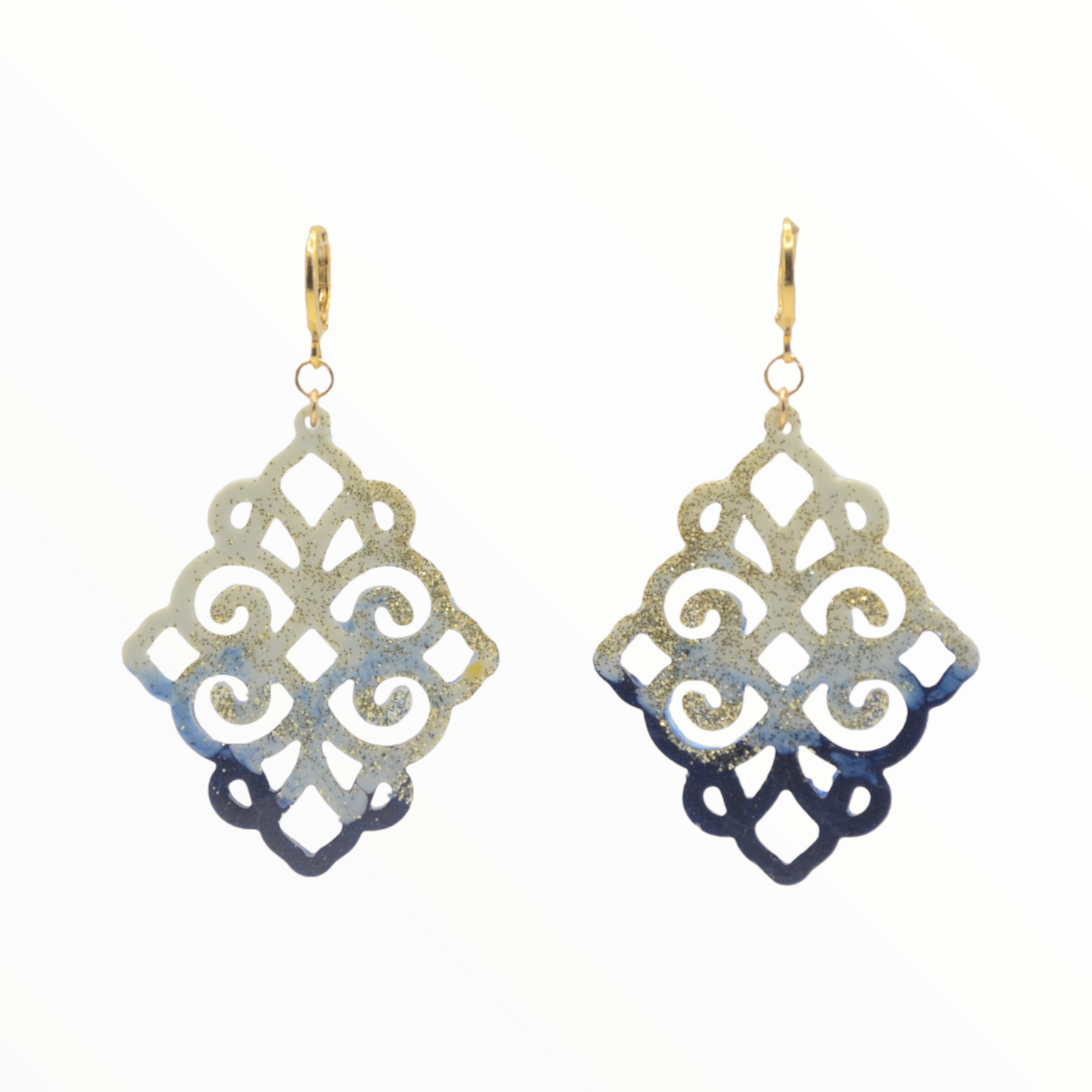 Ornament Ohrringe in Blautönen in Rautenform mit Glitter in Champagner. Goldener Brisurenverschluss.