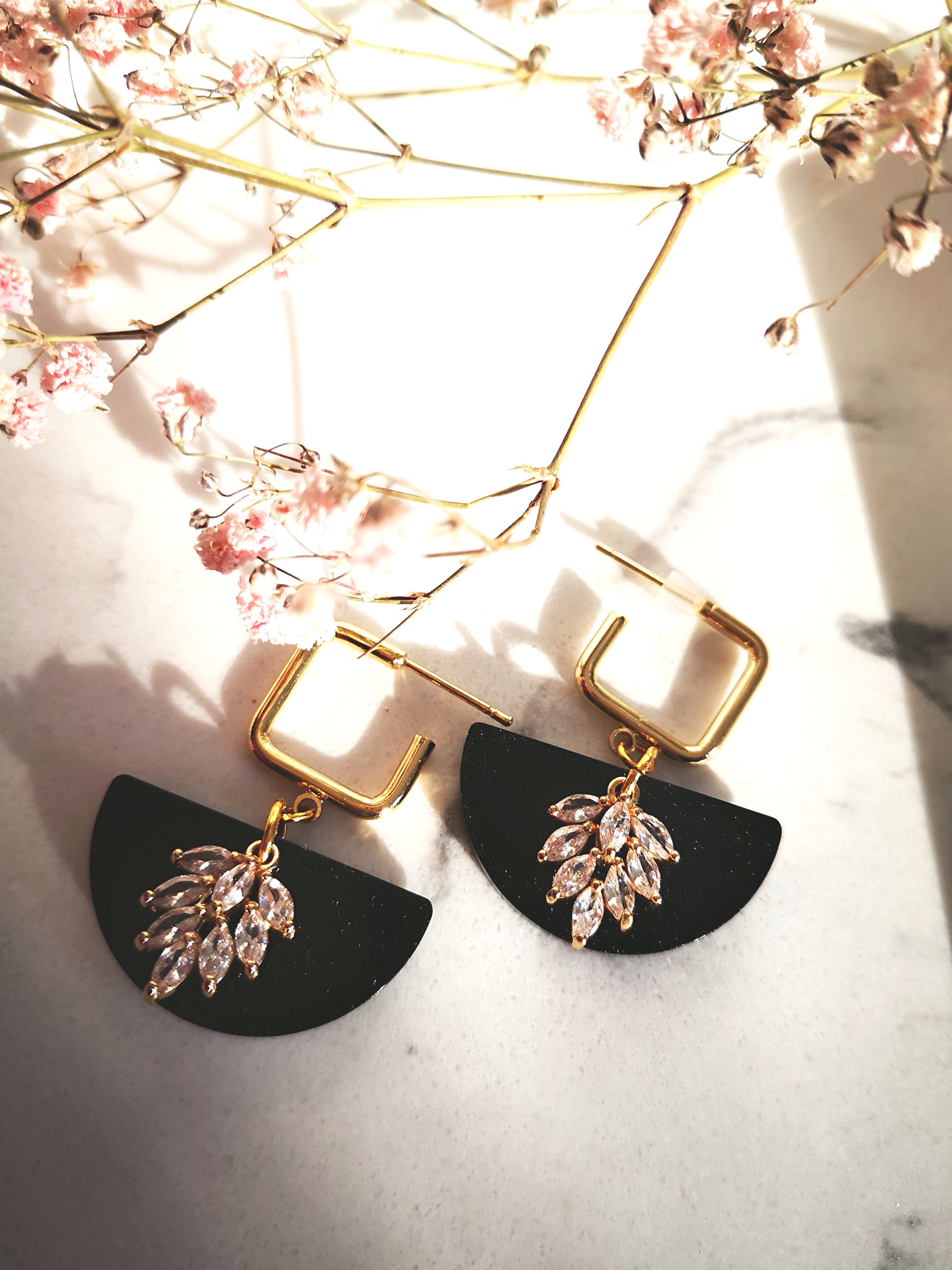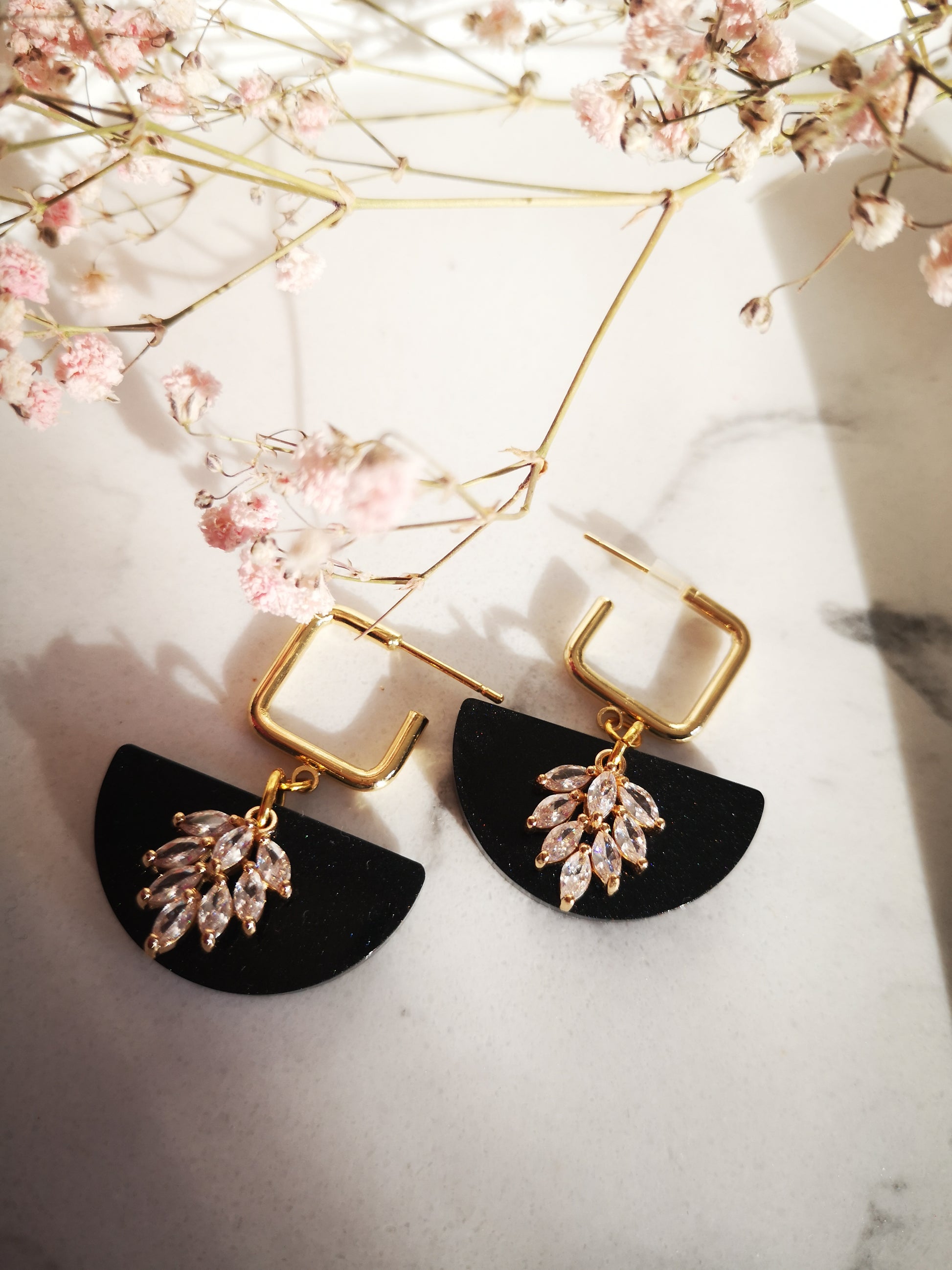 Halbmonde (Halbkreis) aus Resin in Mitternaxhtschwarz mit dunklem Glitter, 18K Glaskristallanhänger sowie einem 18K vergoldetem Stecker.