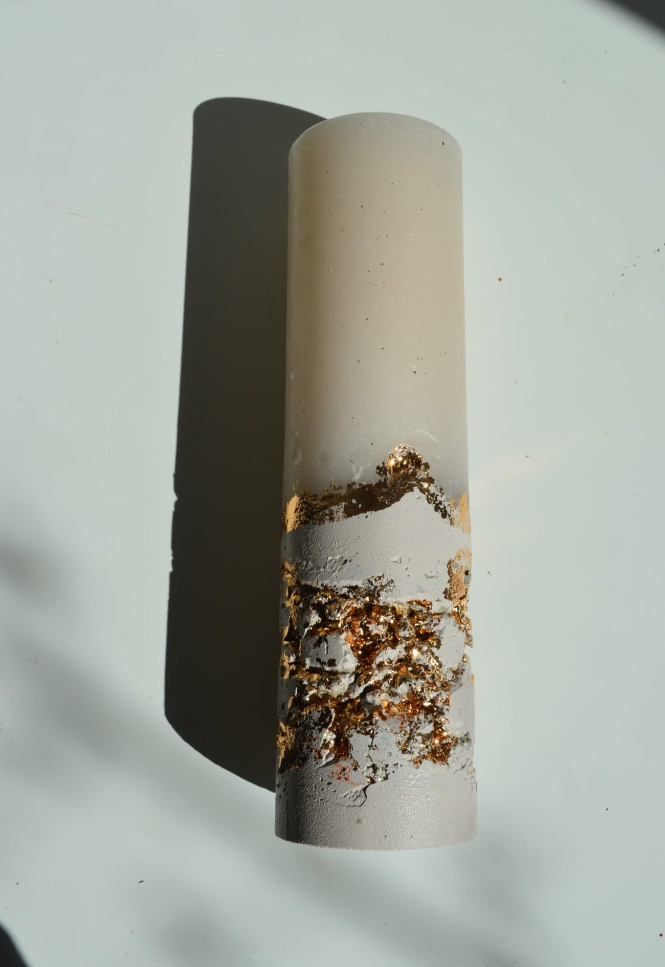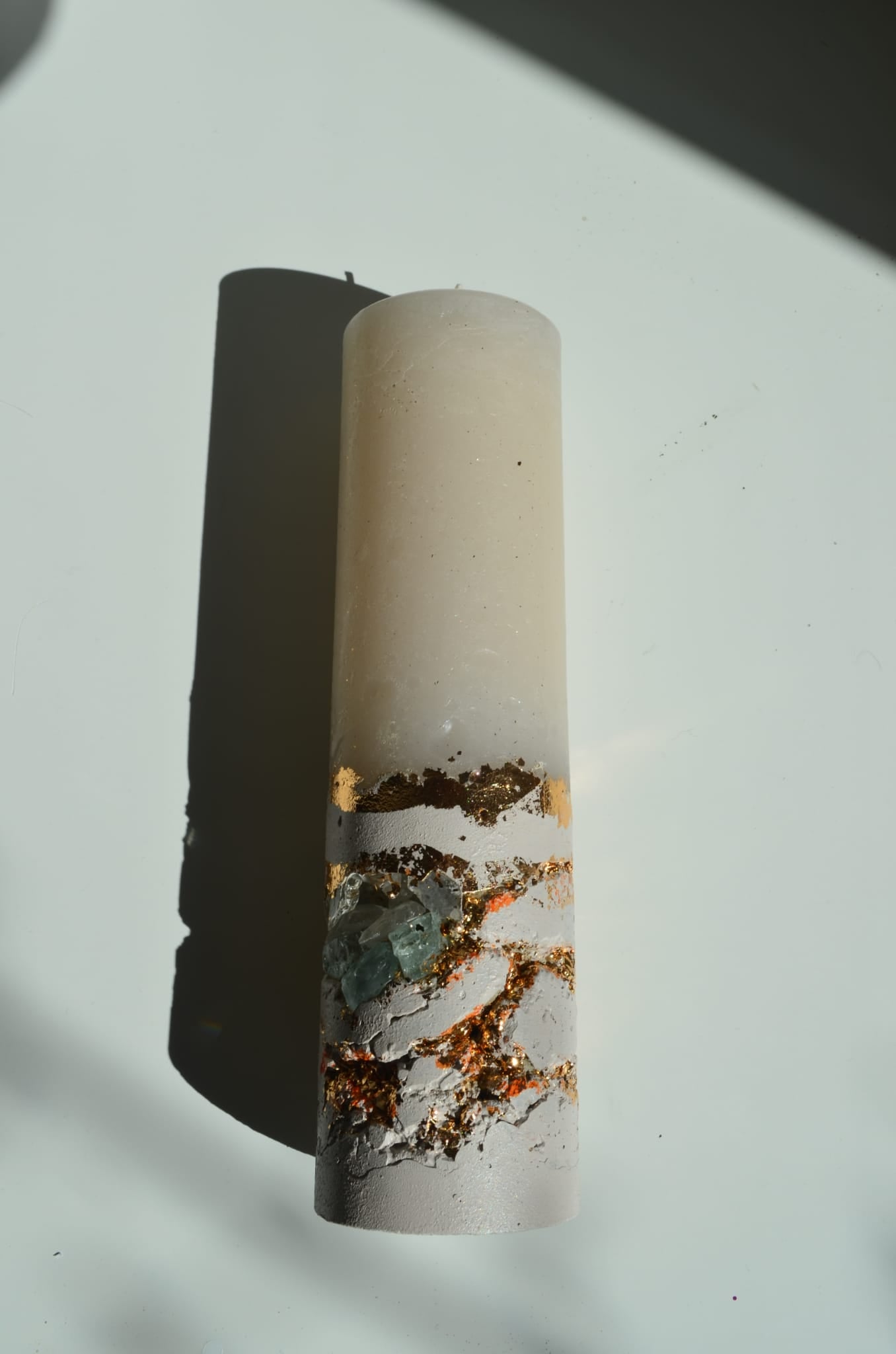 Wunderschöne Rustik Kerze aus hellem Wachs in grau-beige mit einem Betonfuß ebenfalls in hellem greige. Die Kerze ist mit Kristallen und echtem Blattgold in Champagnergold verziert.