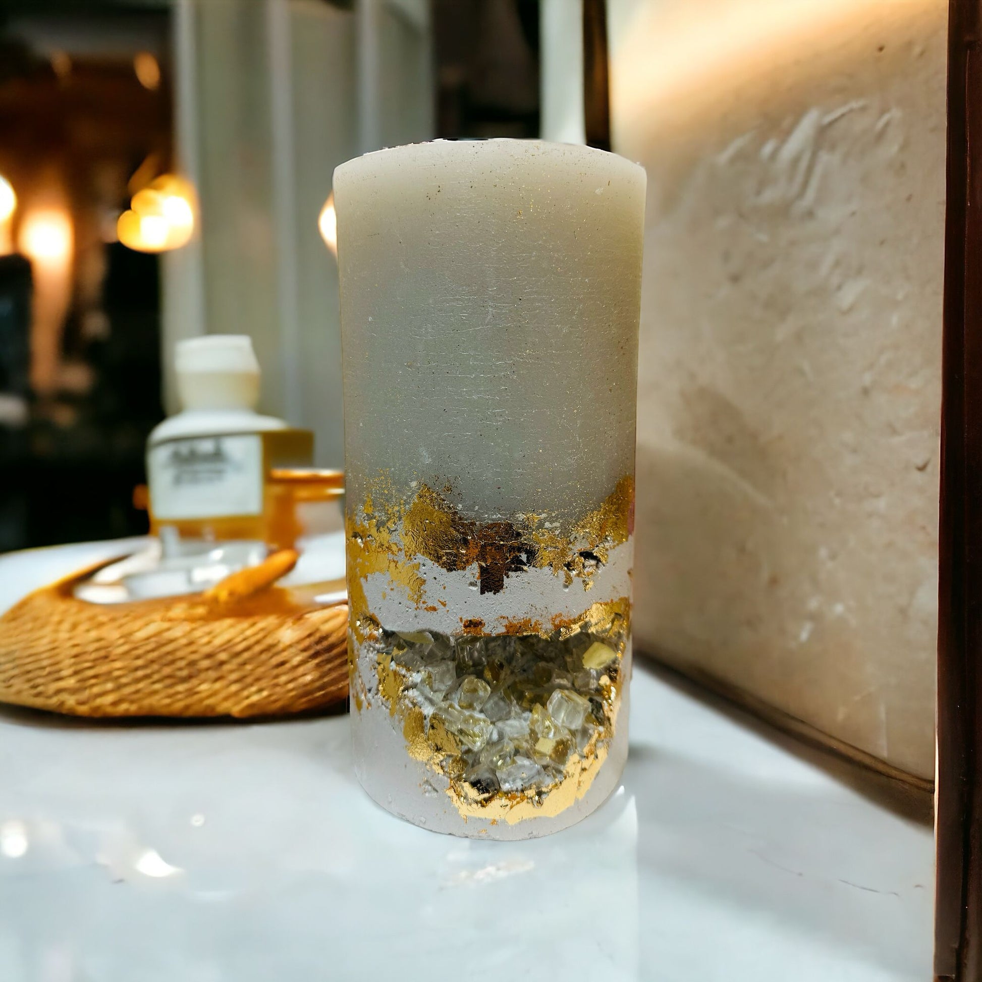 3 wick pillar candle with crystals and gold leaf on a concrete base in the color greige.