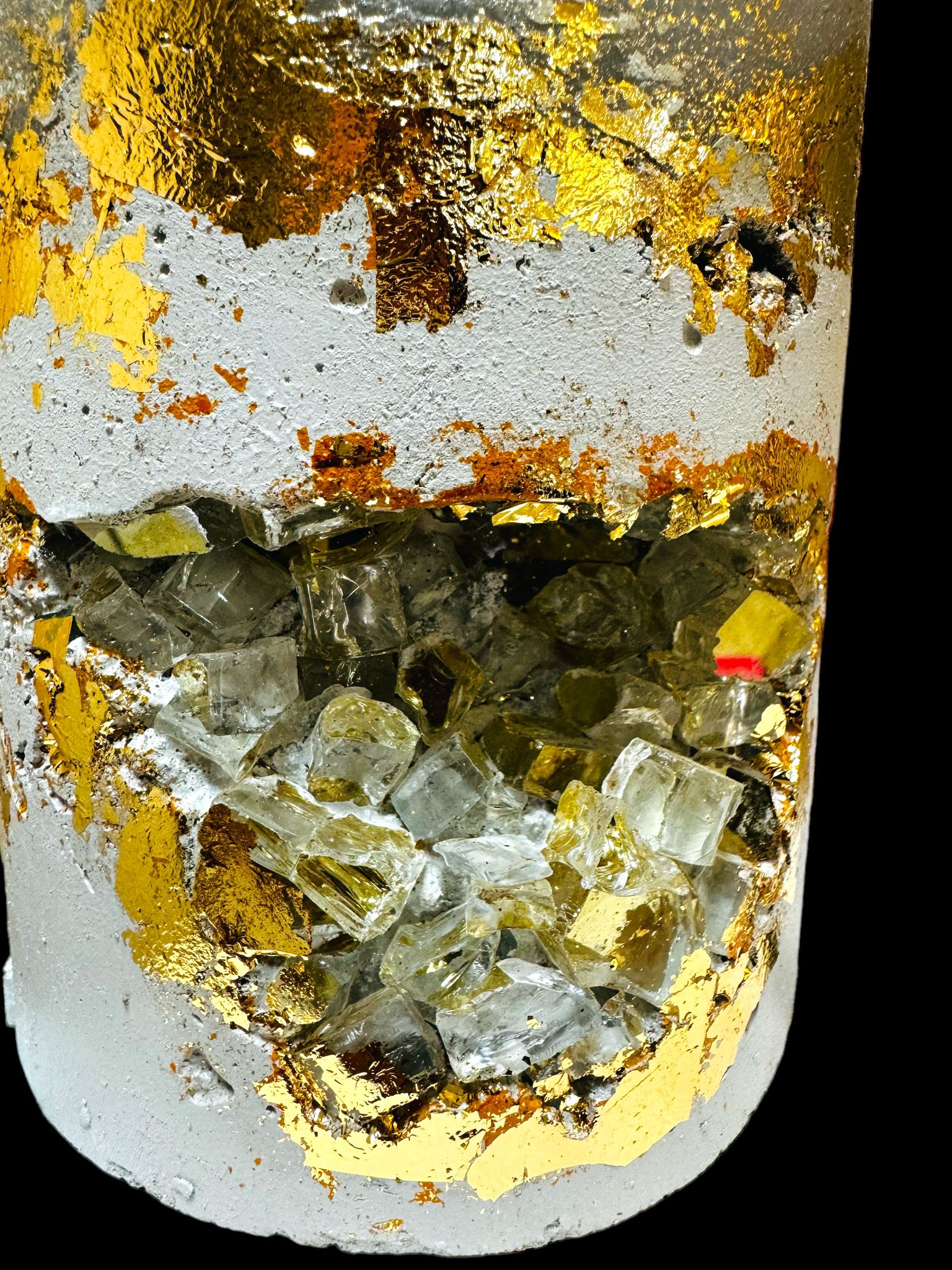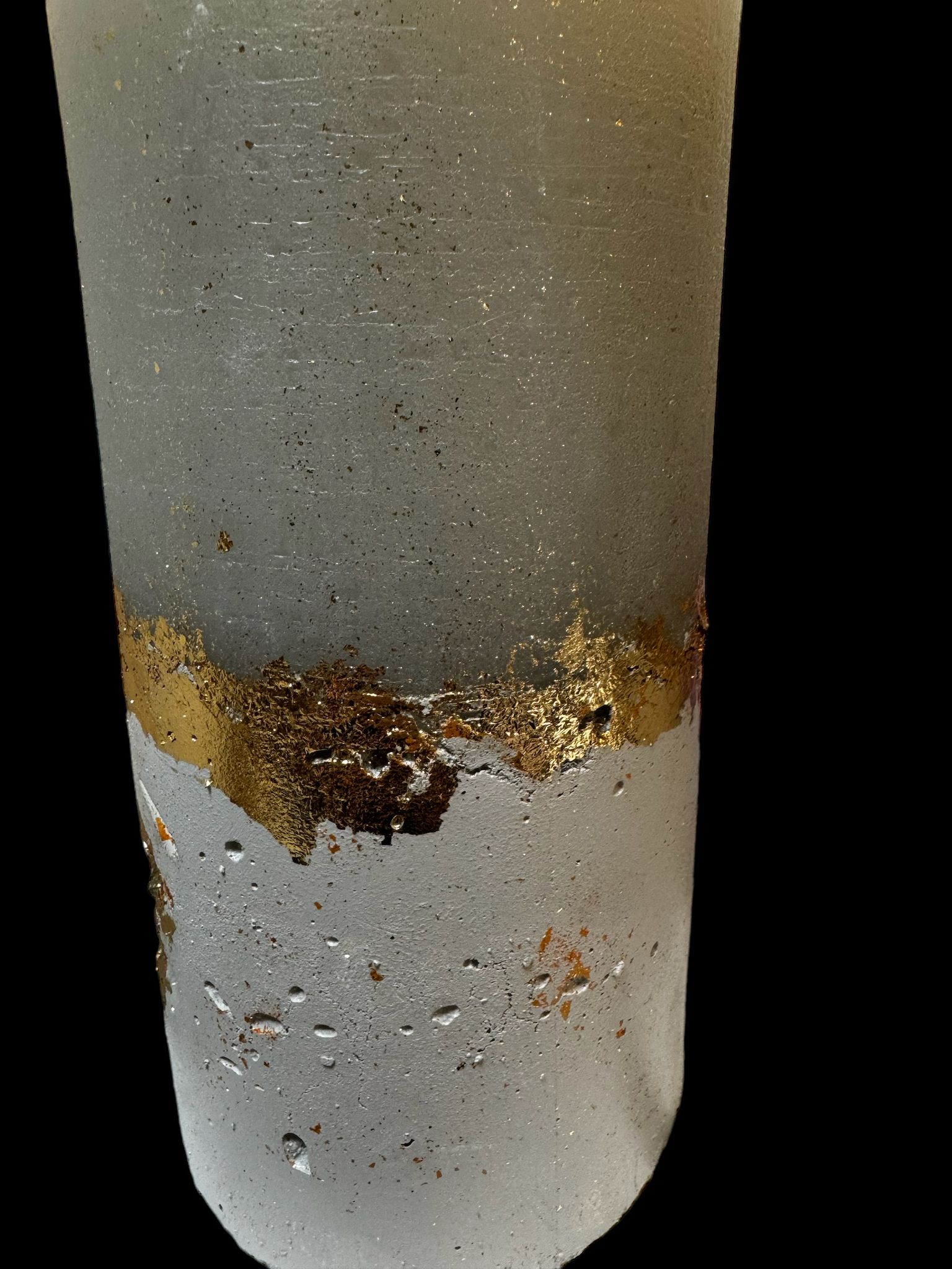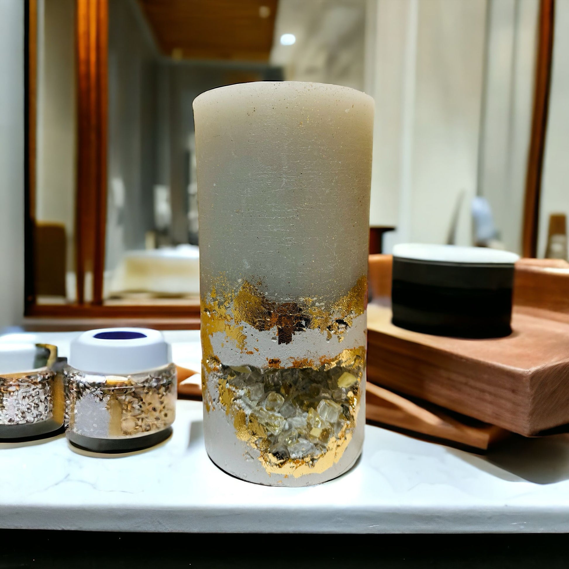3 Docht große Stumpenkerze mit Kristellen und Blattgold auf einem Betonsockel in der Farbe greige.