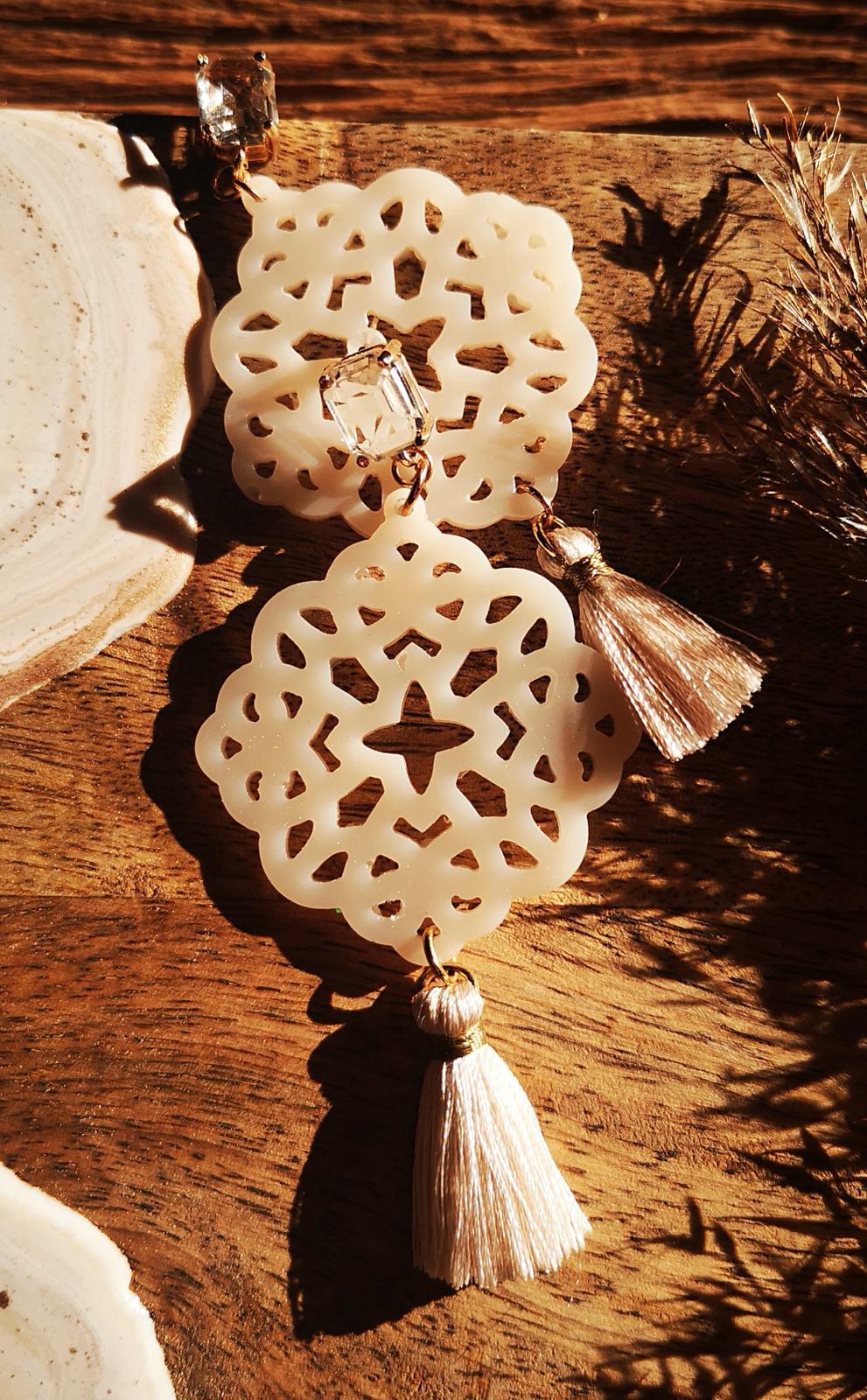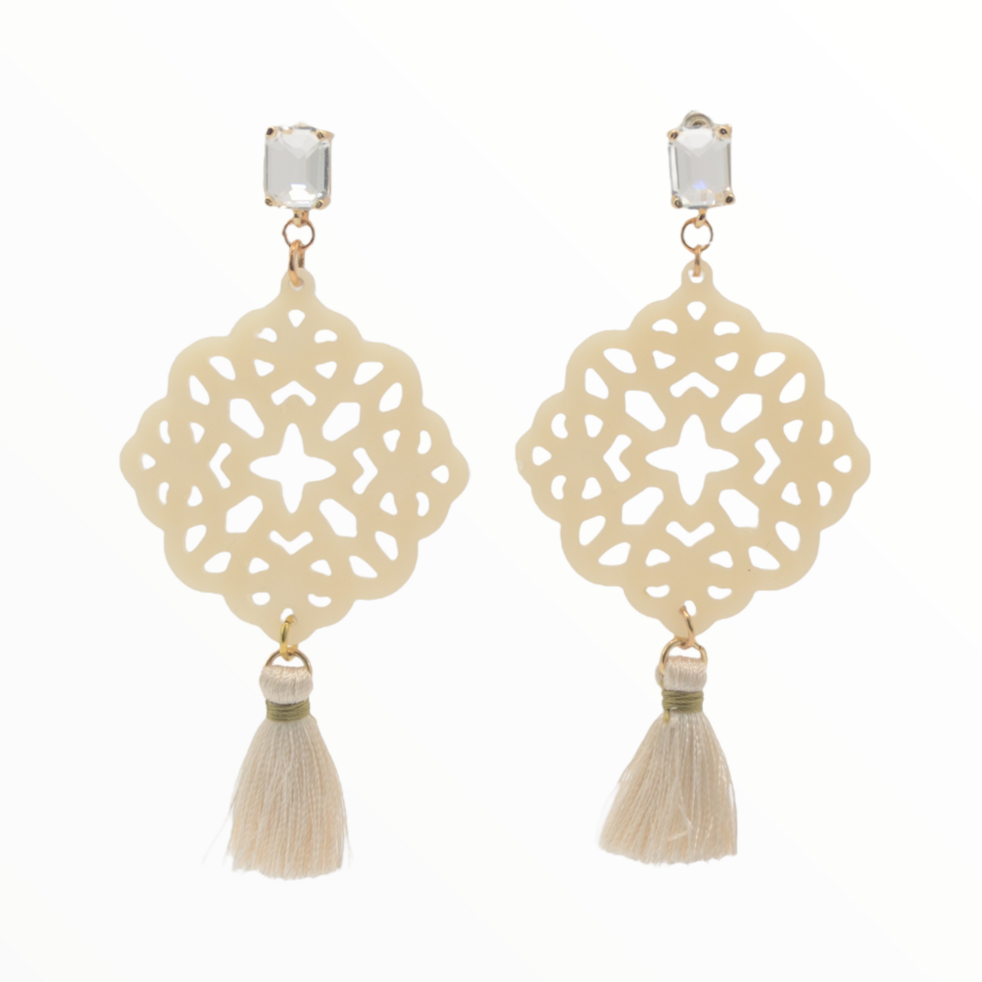 Ornamental resin pendant with silk tassel and glass stud in light beige-nude. Length approximately: 8cm. Very lightweight earring