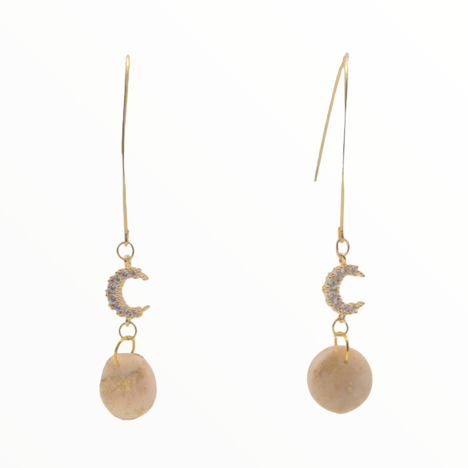 Zarte Ohrringe mit langem goldenen Stecker, 18K Mond und beige - goldenem Planet aus Polymer.
