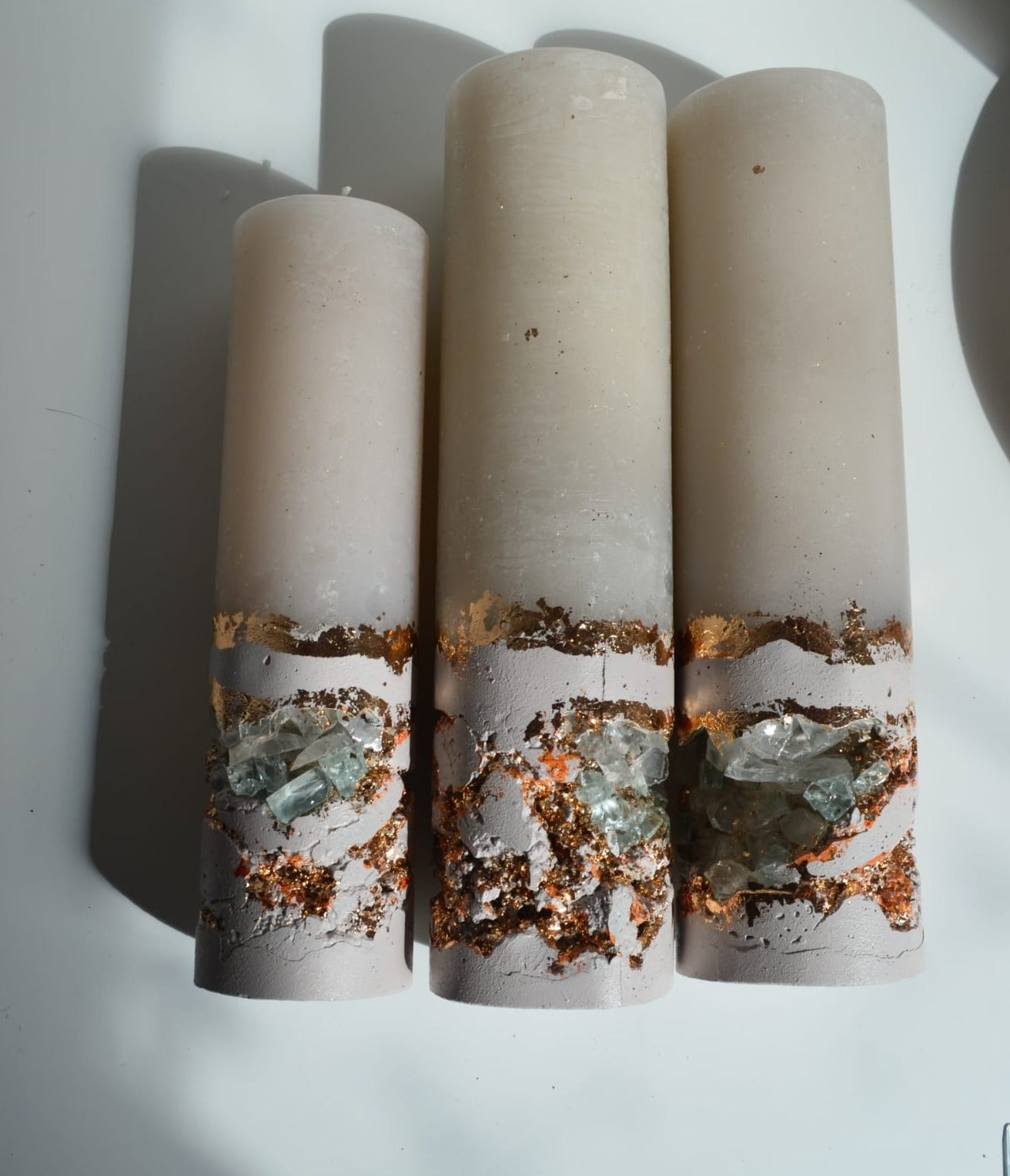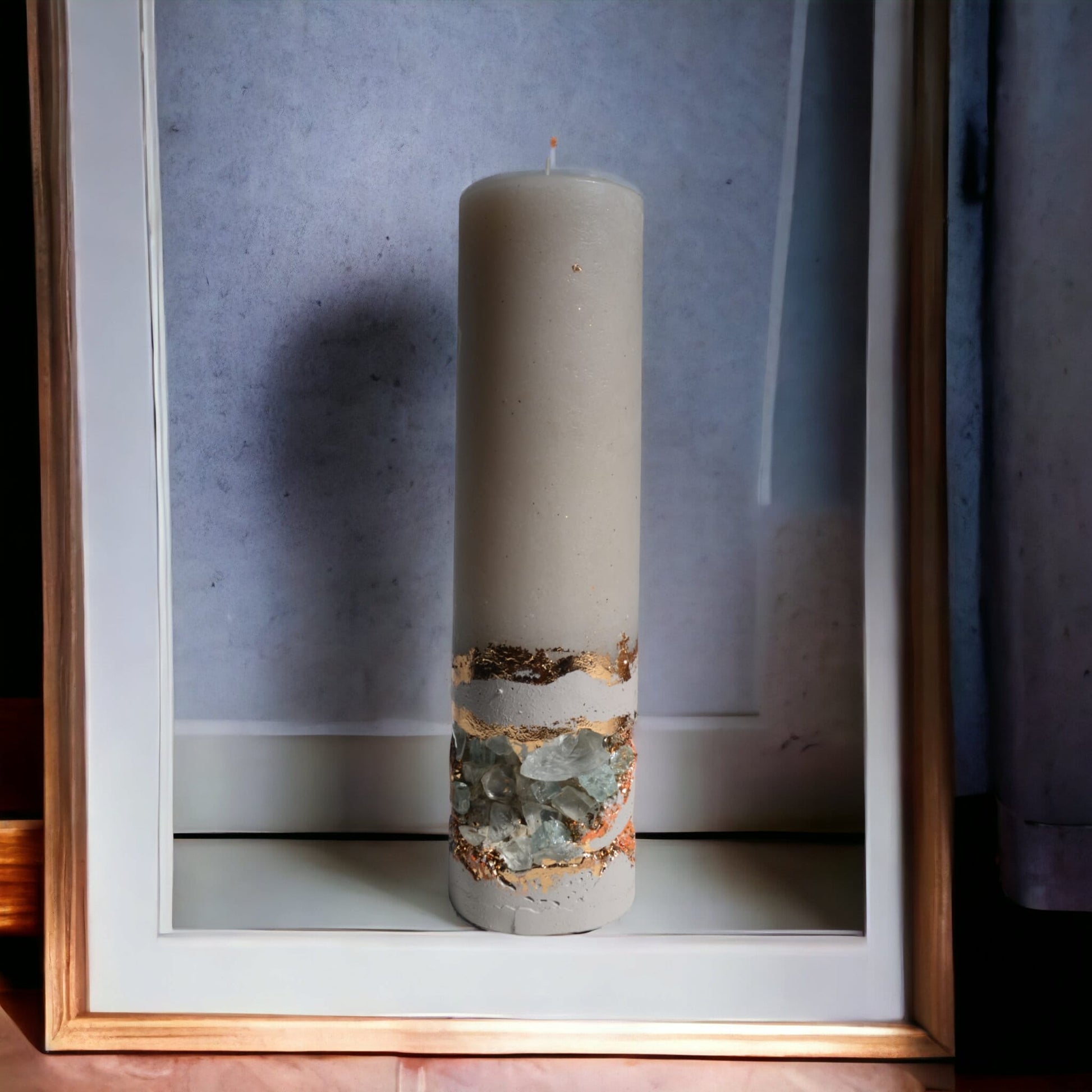 Wunderschöne Rustik Kerze aus hellem greigefarbenem Wachs und einem Betonfuß ebenfalls in hellem greige. Die Kerze ist mit Kristallen und echtem Blattgold in Champagnergold verziert.