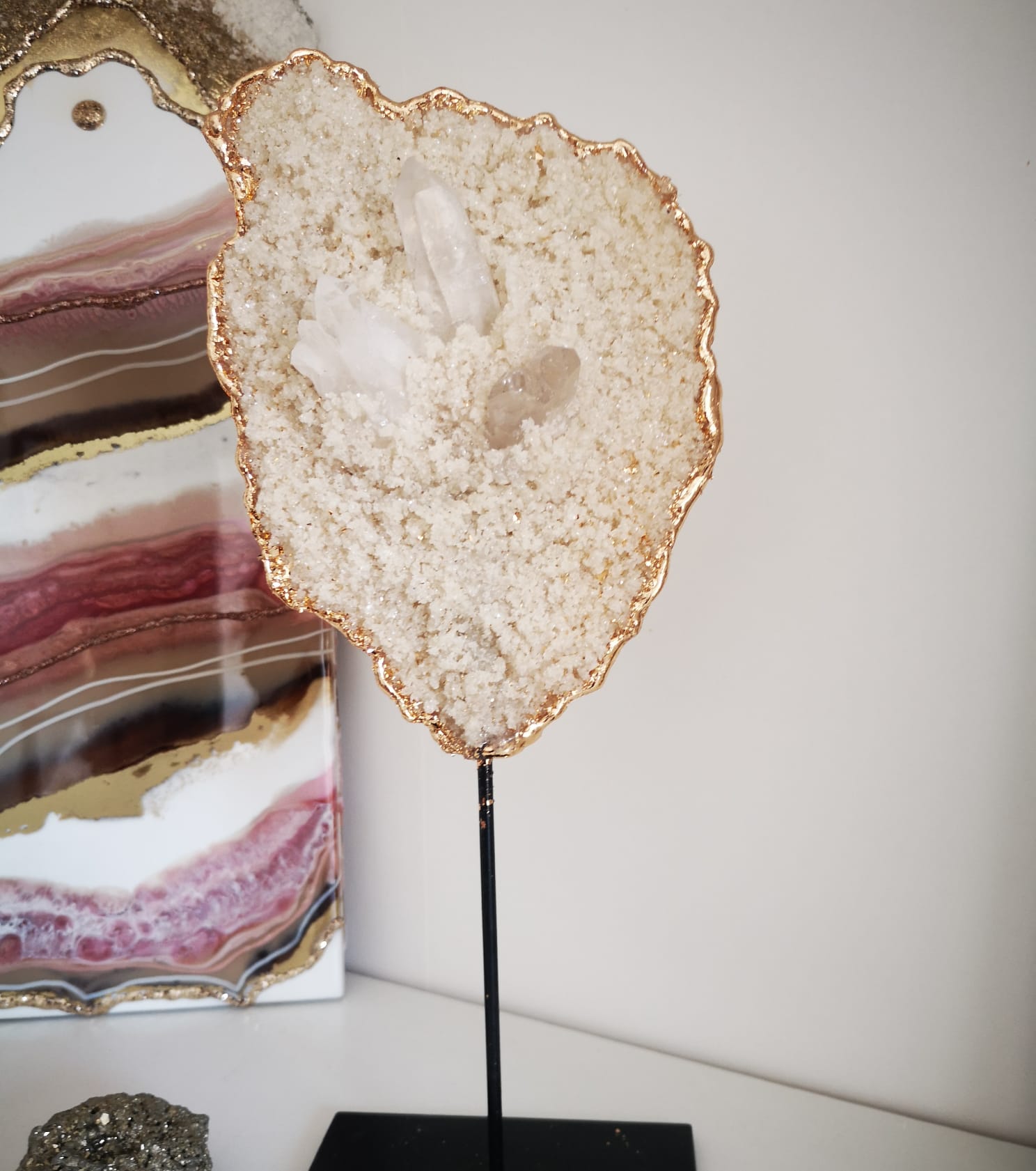 Skulptur aus Quarz und echten Bergkristallen mit filigranem Goldrand auf einem Metallfuß.
